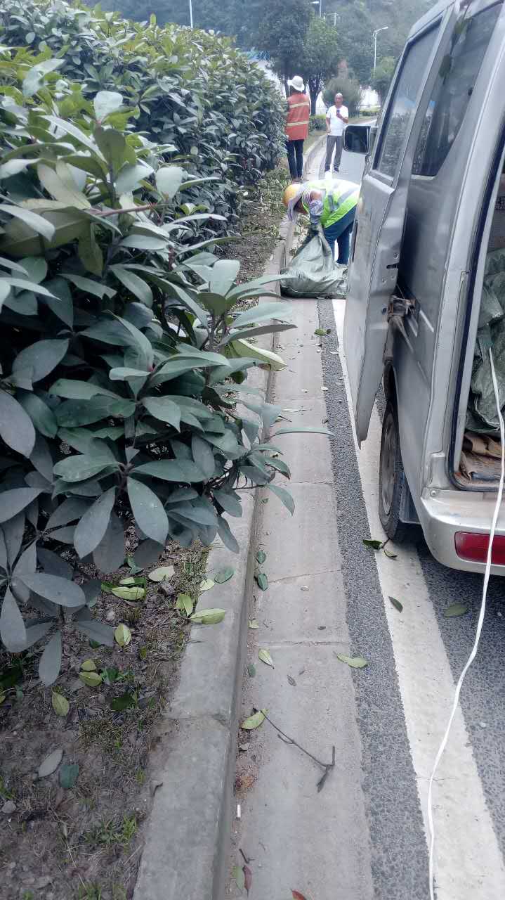 南二環(huán)中央綠化帶修枝剪葉綠化環(huán)境維護(hù)工作正在進(jìn)行中,圖為金海綠化養(yǎng)護(hù)隊(duì)工作中。