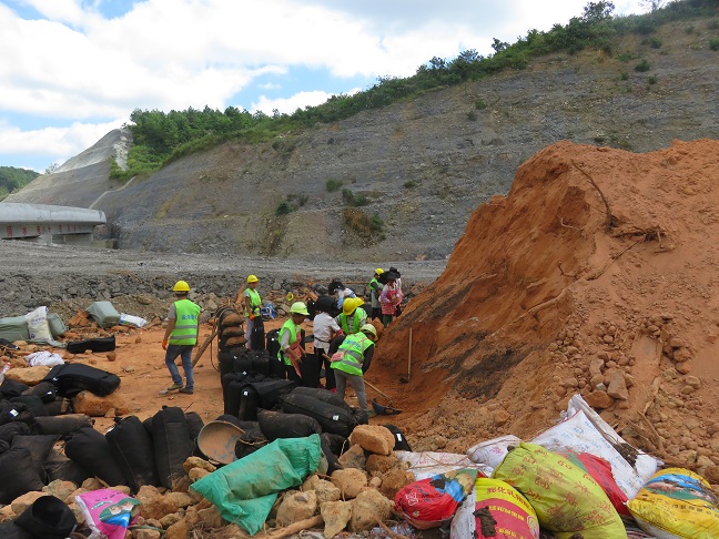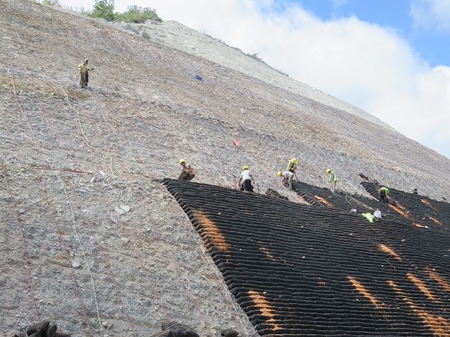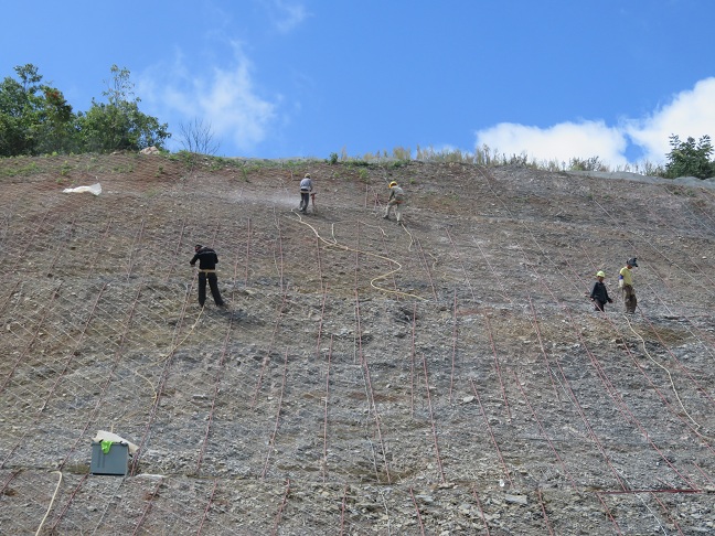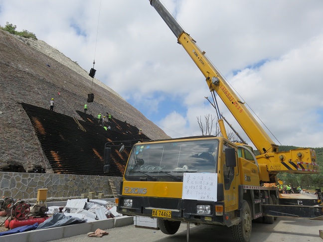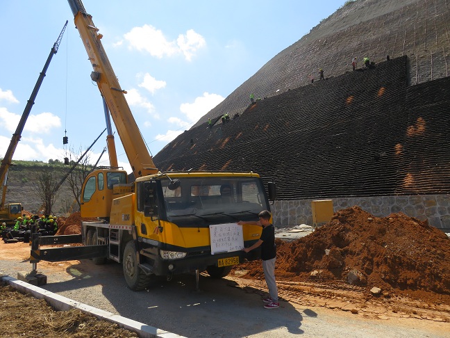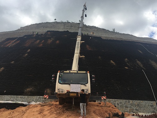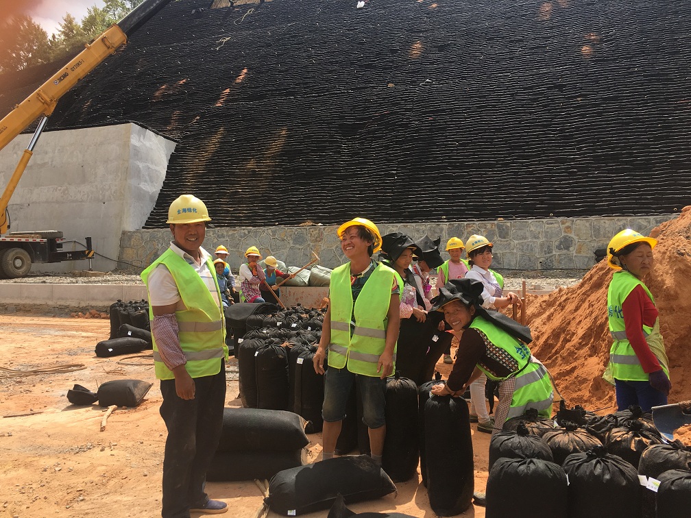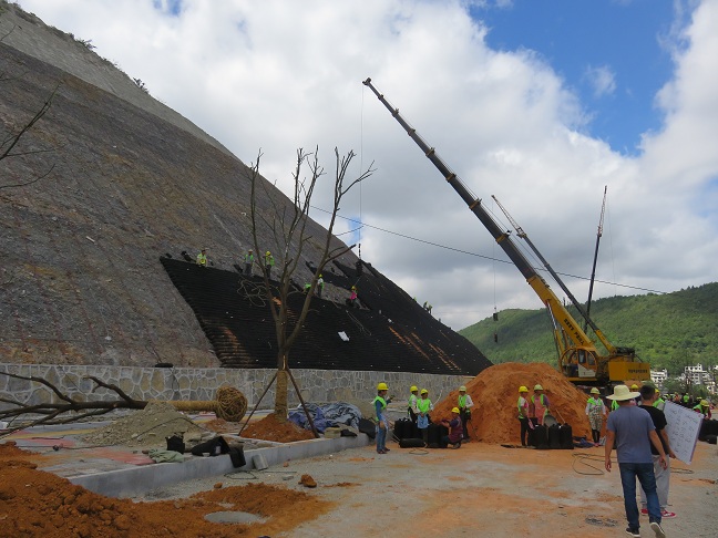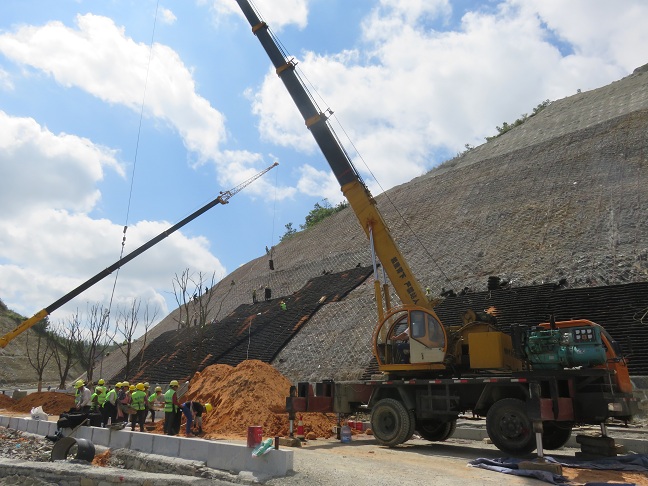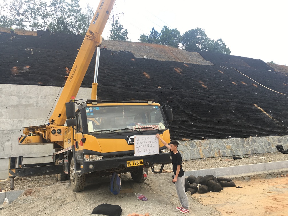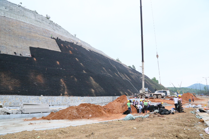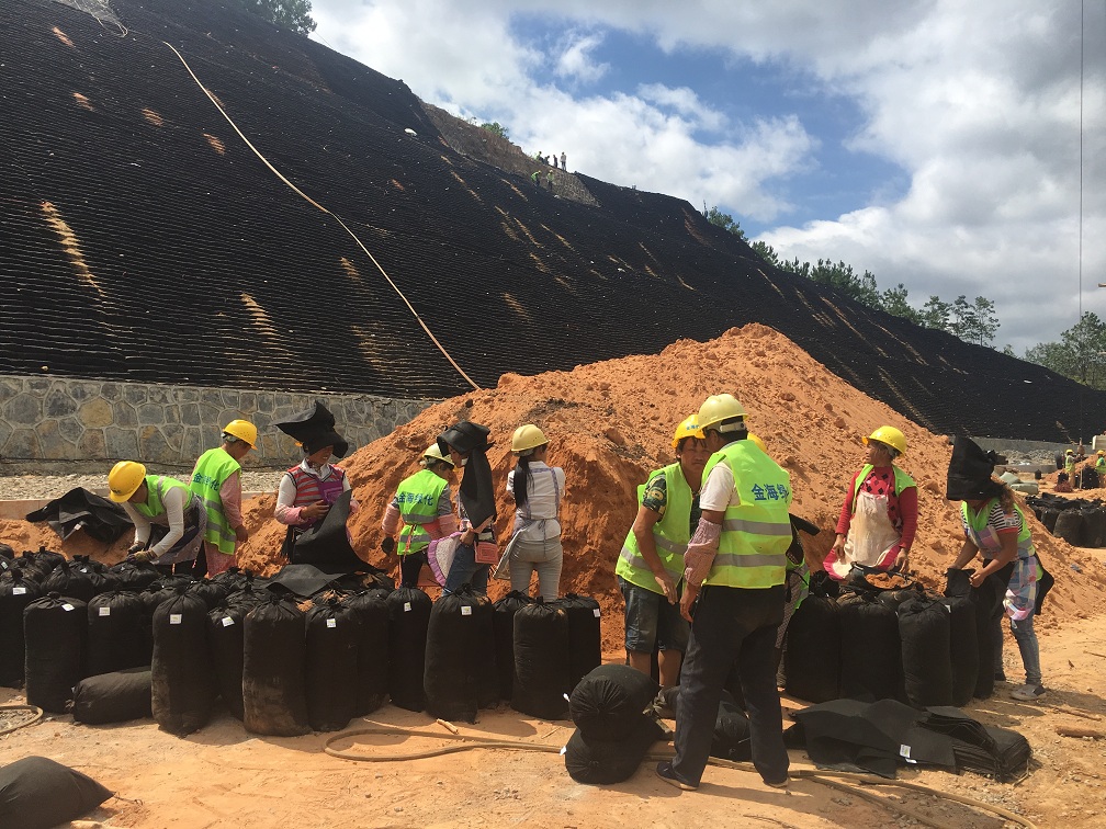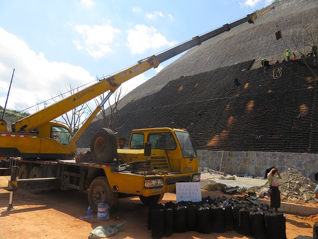 為節省時間,一邊在進行打孔、打錨桿操作、注漿、焊接操作,另一邊進行生態袋碼砌操作。